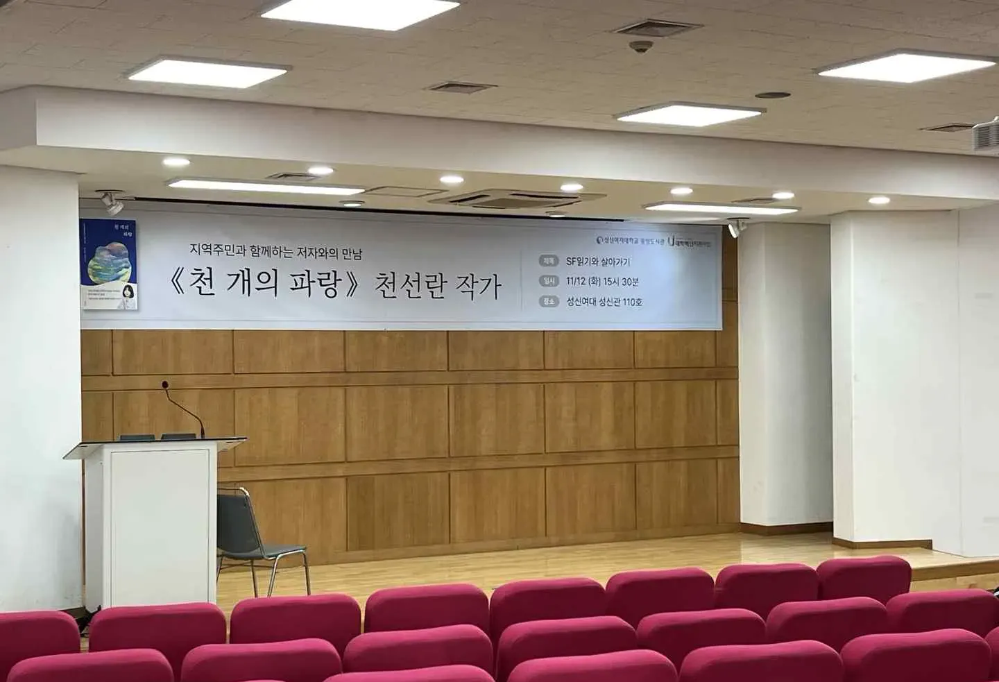 강연 준비해주신 모든 분들 너무 감사합니다. 천선란 작가님을 학교에서 뵐 수 있어서 너무 유익한 시간이었고, 행사가 너무너무 즐거웠습니다. 참여한 모든 분들께 사인도 해주시고, 사인본 증정 이벤트도 있어서 너무 행복했습니다! 중간 중간에 빈 자리들이 있었는데, 다음부터는 자리를 채워서 앉아달라고 안내해주시면 모든 분들이 앉기 원활했을 것 같습니다!