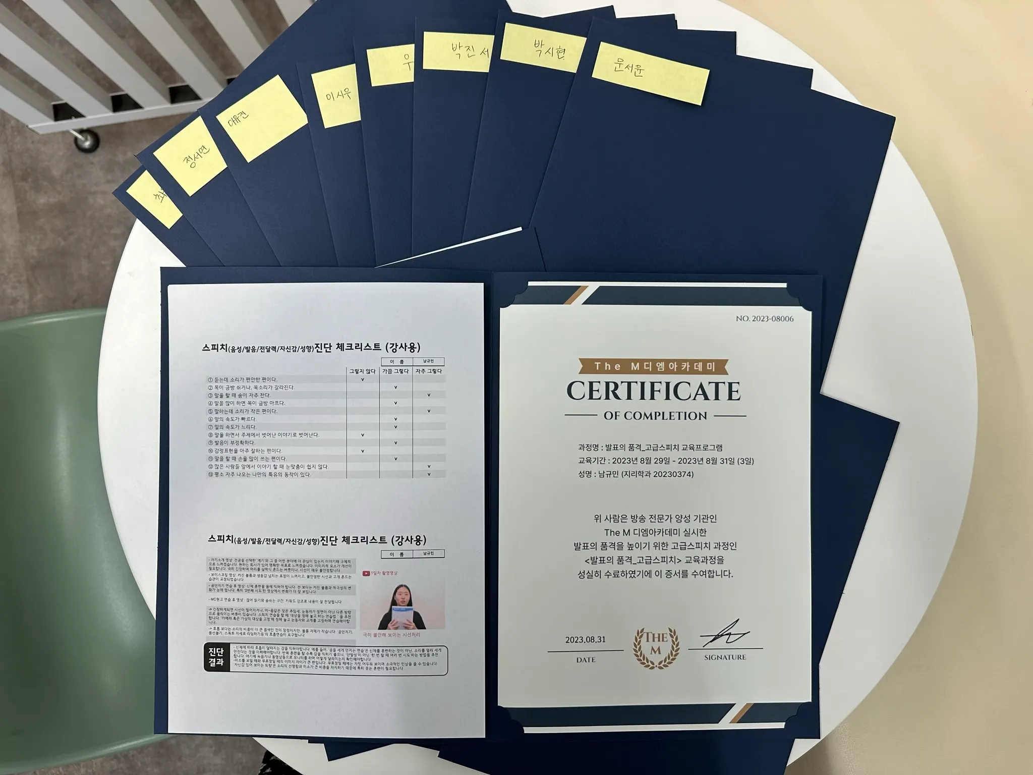 각 참여자의 스피치 스타일, 강/약점, 개인 맞춤형 스피치 훈련법 등을 정리한 스피치 진단지와 수료증 제공